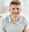 A person is seated at a cluttered workspace, organizing or packaging items. Several clipboards with papers, a notebook, and a variety of tools and boxes are scattered across a wooden table. The individual is wearing a white shirt and appears to be focused on their task.